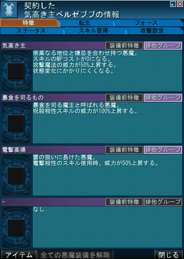 特徴の【現身の主】だけでスキルのHPコスト0のほか近接攻撃の威力50%上昇などポテンシャルはかなり高い様子。DFスロットが最初から8つ開放してあるの気がかりですが…まさか御霊不可とかじゃないよな…?。悪魔全書に登録できるかどうかためしたかったのだが、バザーにも売ってなかったので今のところわからず…サーセン