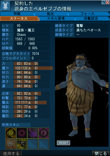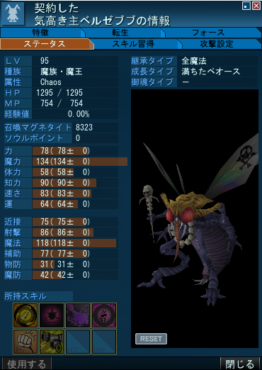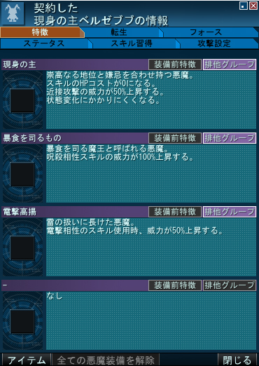 特徴の【現身の主】だけでスキルのHPコスト0のほか近接攻撃の威力50%上昇などポテンシャルはかなり高い様子。DFスロットが最初から8つ開放してあるの気がかりですが…まさか御霊不可とかじゃないよな…?。悪魔全書に登録できるかどうかためしたかったのだが、バザーにも売ってなかったので今のところわからず…サーセン